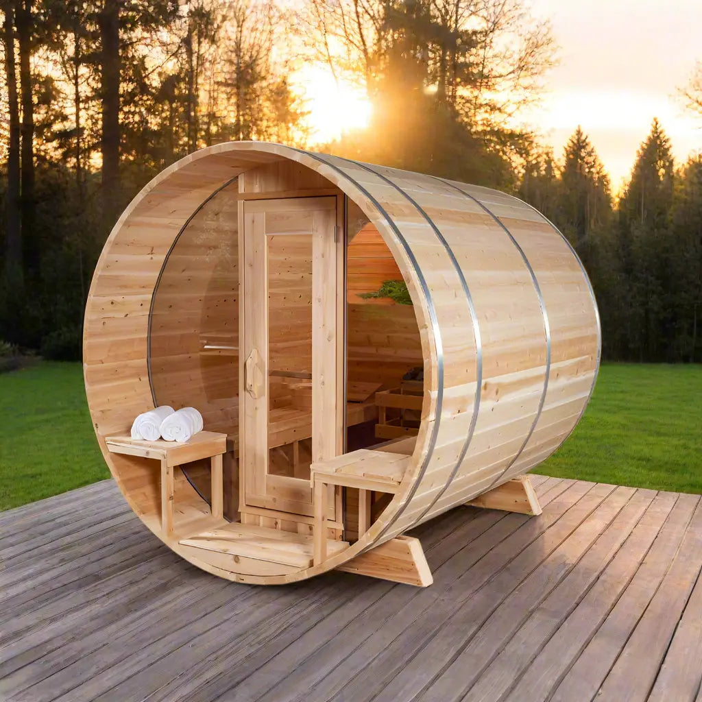 The Dundalk Leisurecraft Canadian Timber 4 Person Serenity MP Outdoor Traditional Barrel Sauna provides a unique outdoor retreat that allows you to unwind and reconnect with loved ones in the comfort of your backyard. Made from beautiful Eastern White Cedar, this spacious sauna comfortably fits four people, ensuring perfect moments of relaxation. The efficient heating and therapeutic benefits contribute to a healthier lifestyle, making it an ideal investment for your well-being. Imagine creating lasting memories and enjoying the refreshing aroma while you enjoy stress relief and warmth.