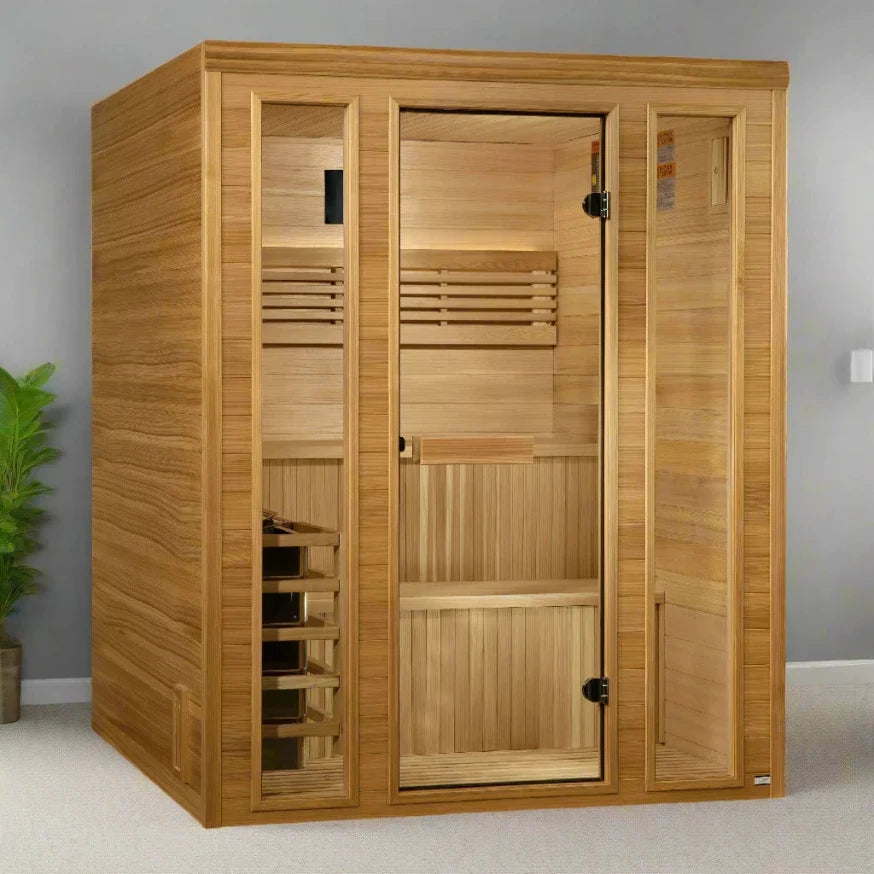 Transform your home into a serene oasis with the Golden Designs Andermatt 3-Person Traditional Indoor Sauna. This sauna not only provides a space for relaxation with its high-quality Pacific Premium Clear Cedar construction but also offers numerous health benefits through steam therapy, making it perfect for those seeking both comfort and wellness. Enjoy the intuitive touch screen control panel, integrated audio system, and calming chromotherapy lighting for a truly immersive personal retreat.