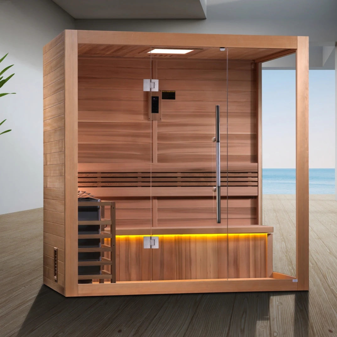Transform your space into a personal retreat with the Forssa 3-Person Traditional Indoor Sauna. Featuring a stunning Canadian Red Cedar interior and a Harvia electric heater, this sauna not only helps you unwind but also lets you enjoy the health benefits of steam therapy from the comfort of your home. With easy assembly and modern features like Bluetooth connectivity and chromotherapy lighting, it's your perfect escape for relaxation and rejuvenation.