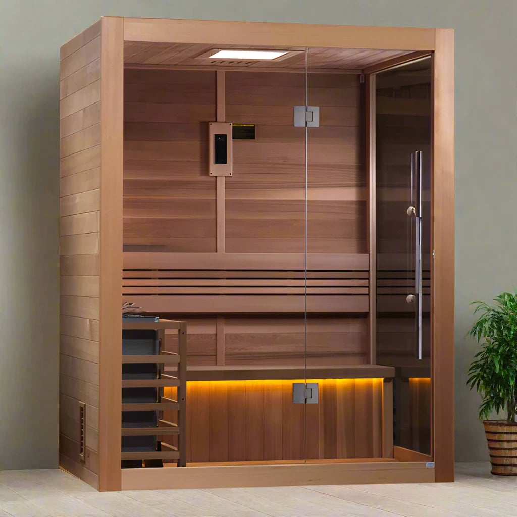 The Golden Designs Hanko 3-Person Traditional Indoor Sauna offers you the perfect retreat to unwind and revitalize your body and mind in the comfort of your home. With its luxurious Canadian Red Cedar interior, soothing red light therapy, and built-in features like Bluetooth and FM radio, this sauna transforms your space into a personal oasis while providing a simple assembly experience. Enjoy quality time with friends or family as you indulge in steam therapy that rejuvenates your senses and promotes relaxation.
