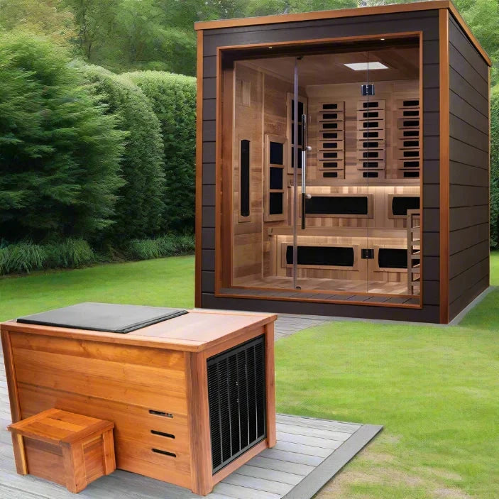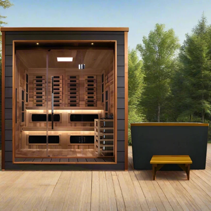 The Golden Designs Karlstad 6-Person Hybrid Outdoor Sauna offers you the ultimate relaxation experience with its combination of full spectrum infrared heating and a traditional electric heater. Imagine unwinding in a luxurious Canadian red cedar sauna that not only soothes your muscles but also provides a tranquil space for clear thinking or stress relief. This complete sauna kit comes with everything you need to create a peaceful retreat right in your backyard.