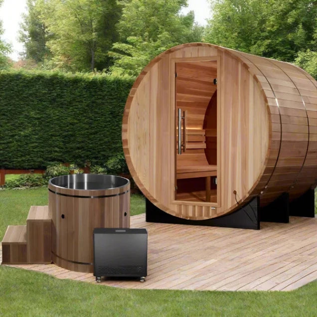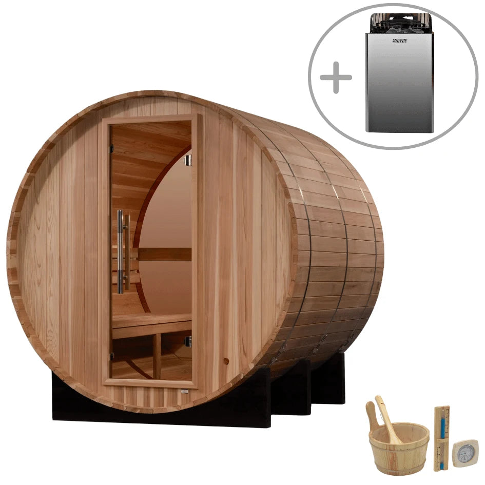 The Golden Designs Zurich 4-Person Outdoor Barrel Sauna transforms your backyard into a soothing retreat. Enjoy the benefits of relaxation and wellness with a stylish sauna that features a stunning bronze-tinted rear window and a powerful Harvia electric heater, all designed for easy DIY setup. Whether you're unwinding alone or sharing the experience with friends, this sauna offers an inviting space for rejuvenation.