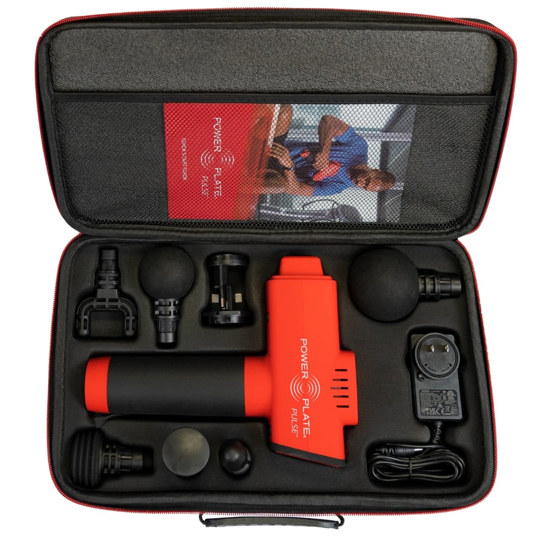 The Power Plate Pulse Massage Gun is a portable, handheld massager designed to relax and rejuvenate tight and sore muscles, release fascia, and promote blood flow. It features four intensity levels and six specialized attachments for targeted relief across various muscle groups.