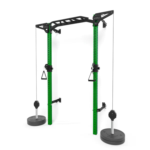 The 3-sided trolley moves smoothly up and down the rack’s uprights, allowing you to position the pulley at any height for different exercises. The double pop-pin system locks it securely in place, and its design allows the rack to still fold flat when not in use, keeping your gym tidy.
