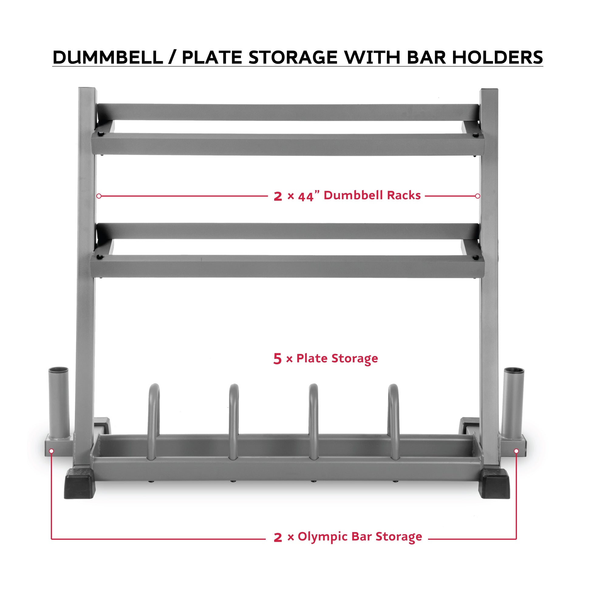 The XMARK All-In-One Storage Solution is a rugged storage solution supporting 400 lbs. of dumbbells and 350 lbs. of plates. This ultimate space saver stores dumbbells, plates, and two Olympic bars, enhancing any gym space with its sleek design. It features quick access shelves for dumbbells and heavy-duty plate storage for Olympic and bumper plates. With easy assembly and clear instructions, this storage solution is both practical and stylish.